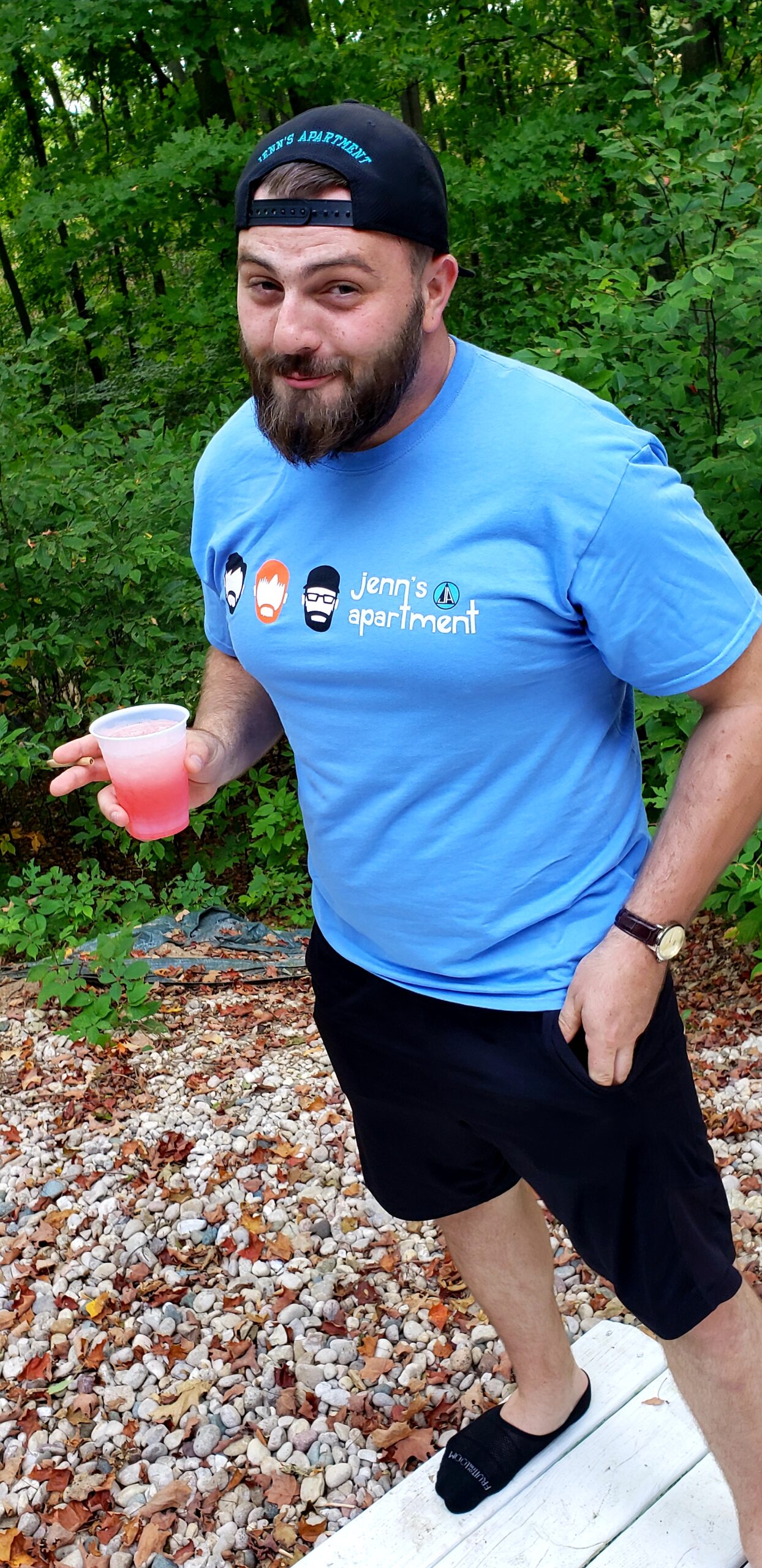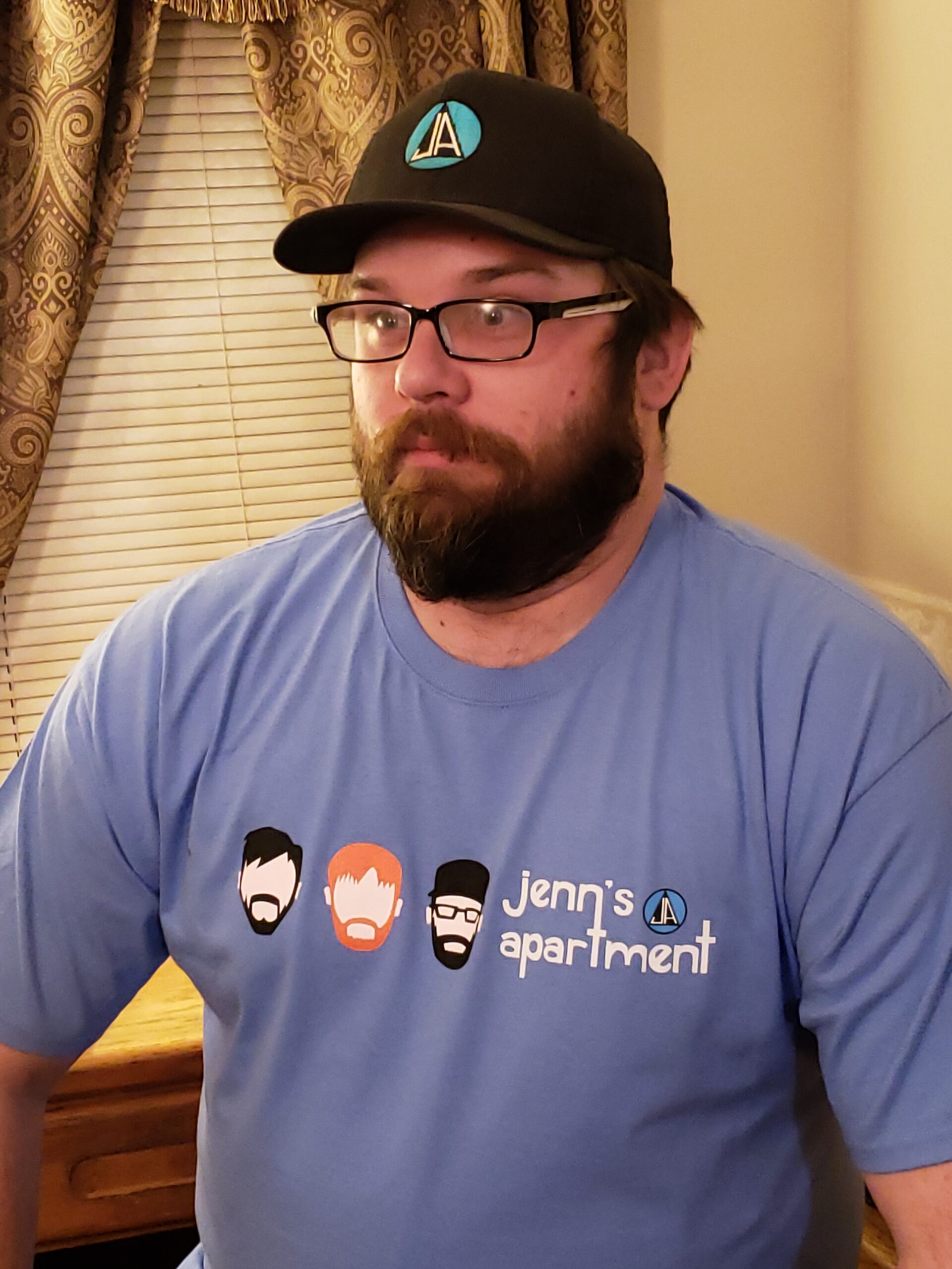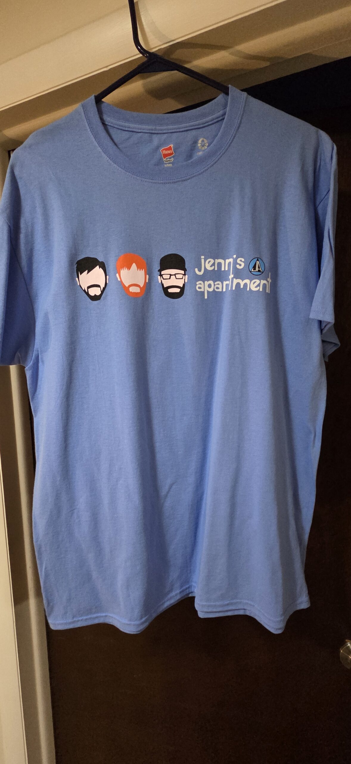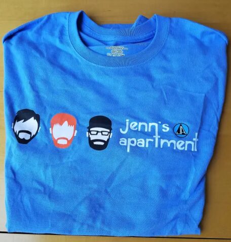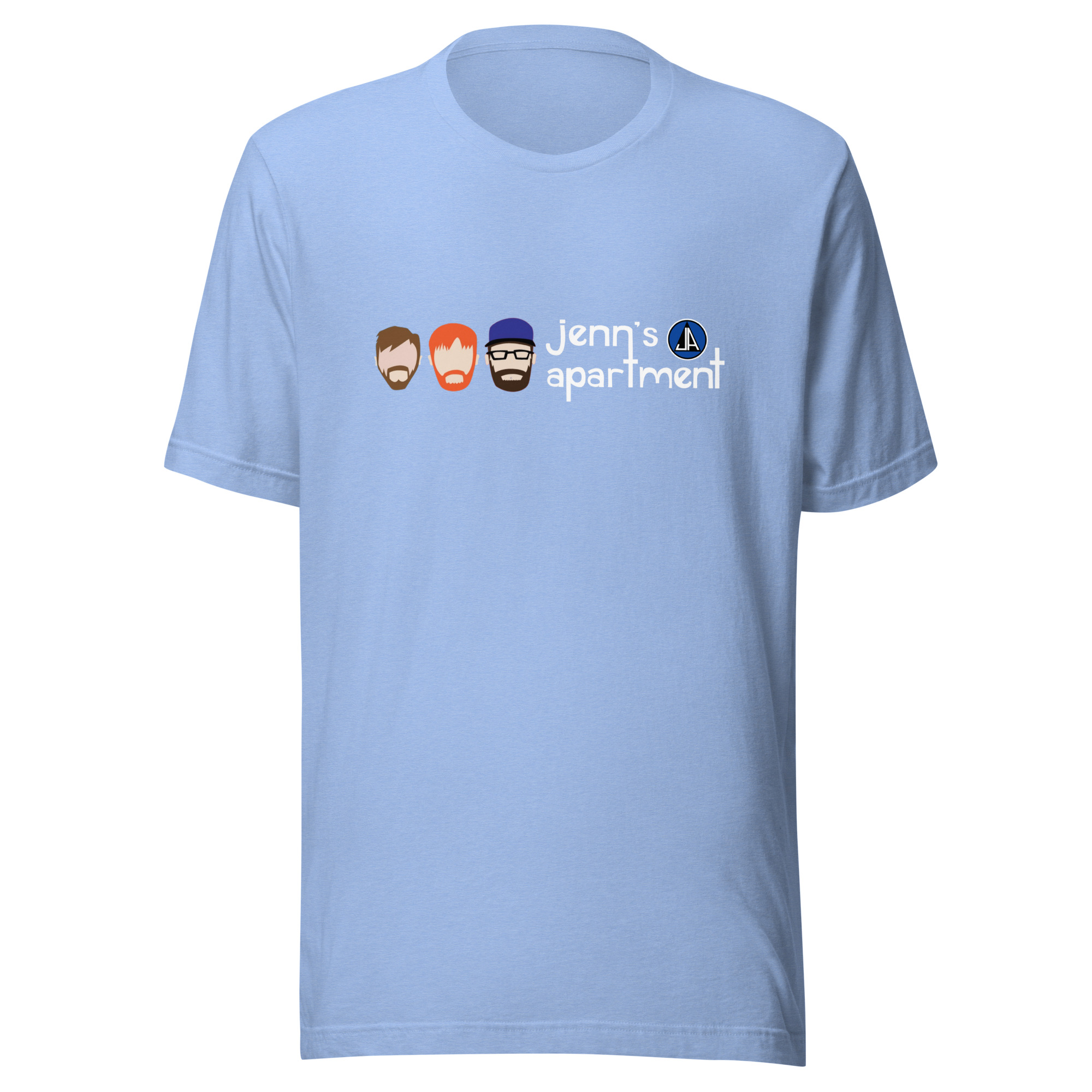 Jenn’s Apartment baby blue t-shirt with custom logo and font.