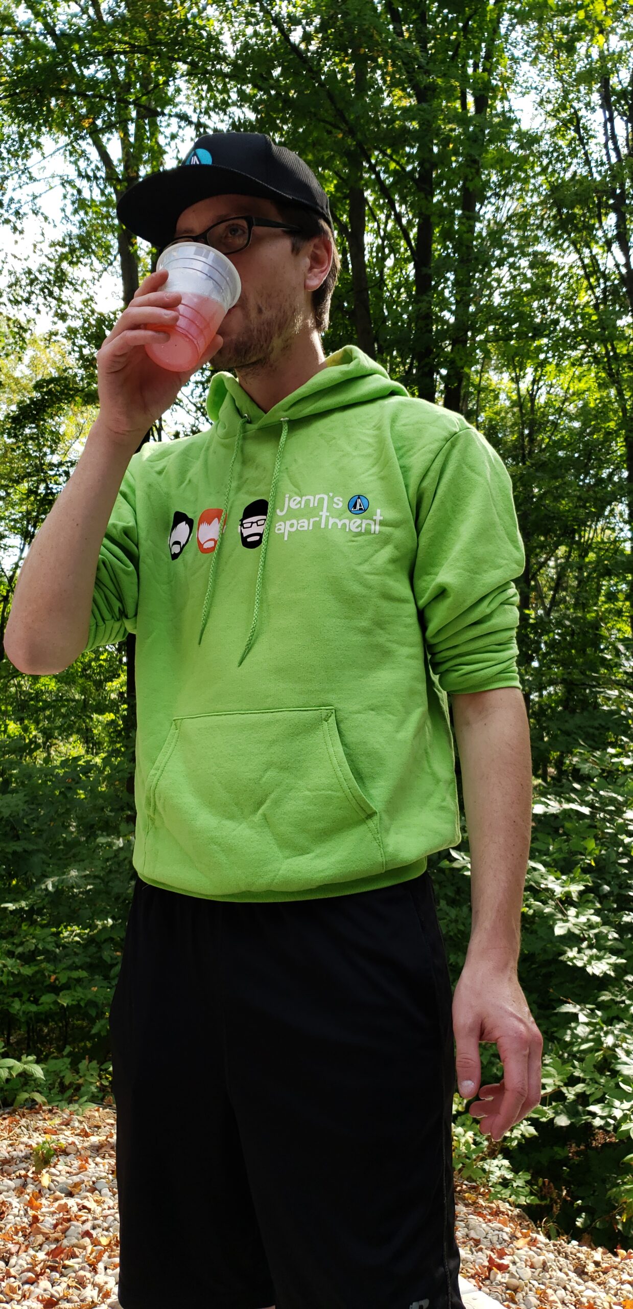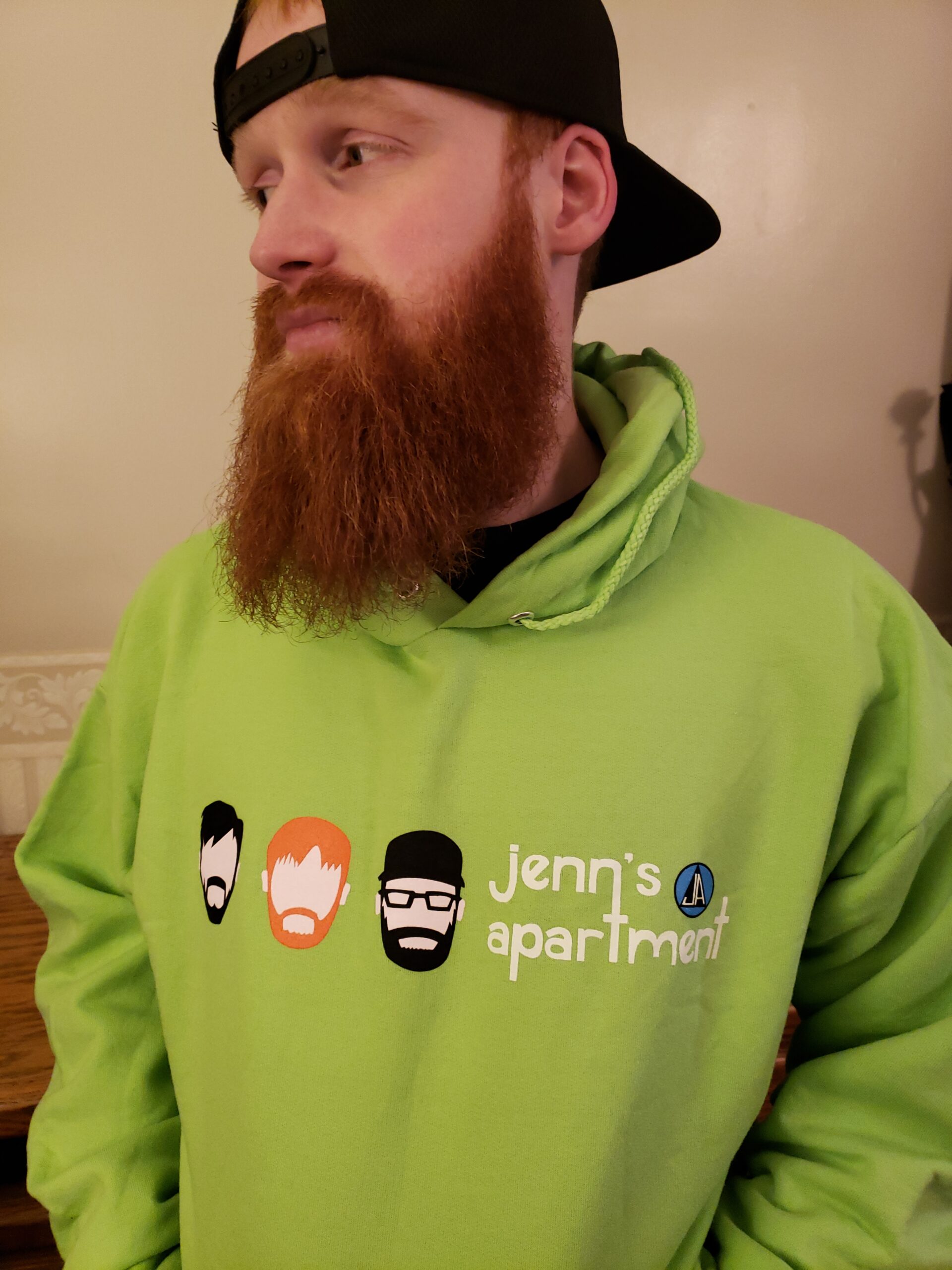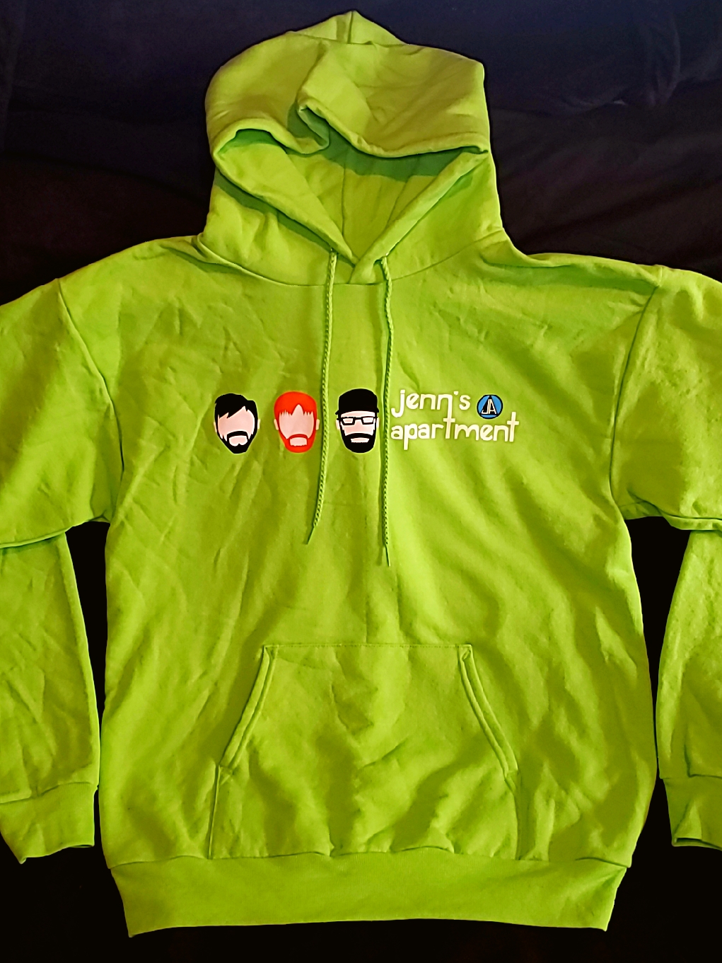 Jenn’s Apartment lime green hoodie with custom logo and font.