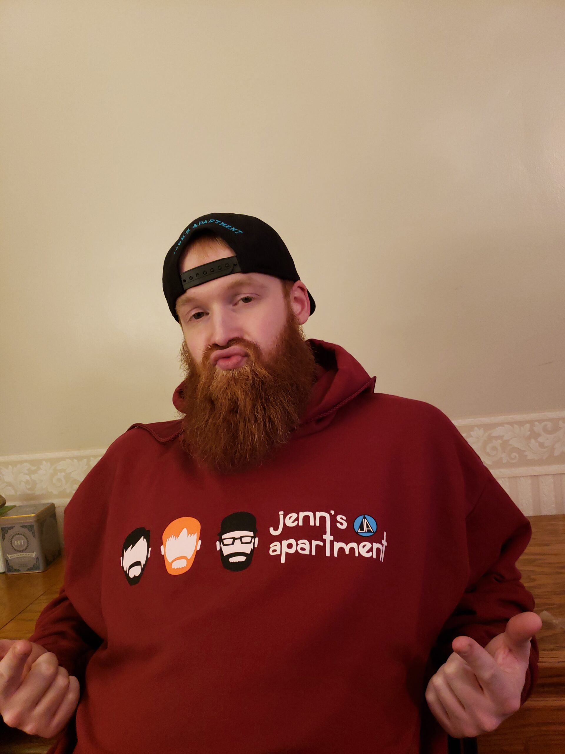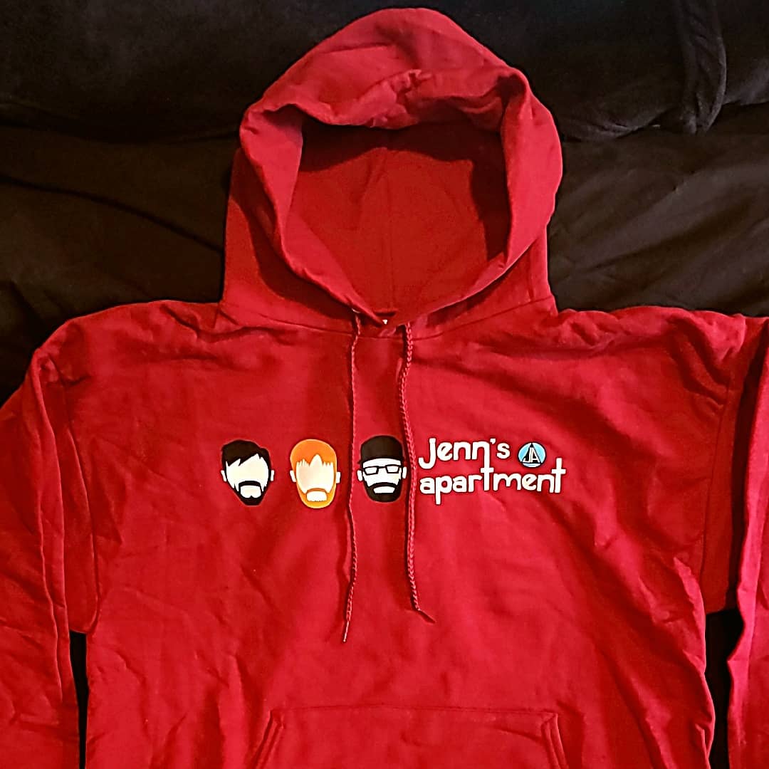 Jenn’s Apartment maroon hoodie with special logo and font.